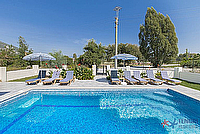 Garden: Private swimming pool, private garden, sunbathing area, deck chairs, dining table and chairs, shower, sun umbrella and barbecue.